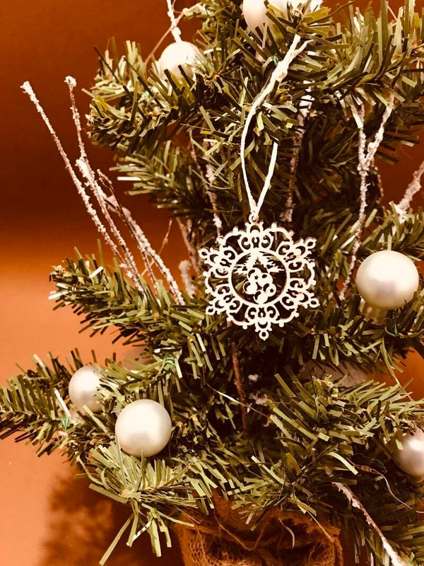 Sneeuwvlok van hout met daarin zeer fijn uitgesneden kerstballen en meerdere ophang gaten. Deze fijne sneeuwvlok is te verkrijgen in de volgende maten: