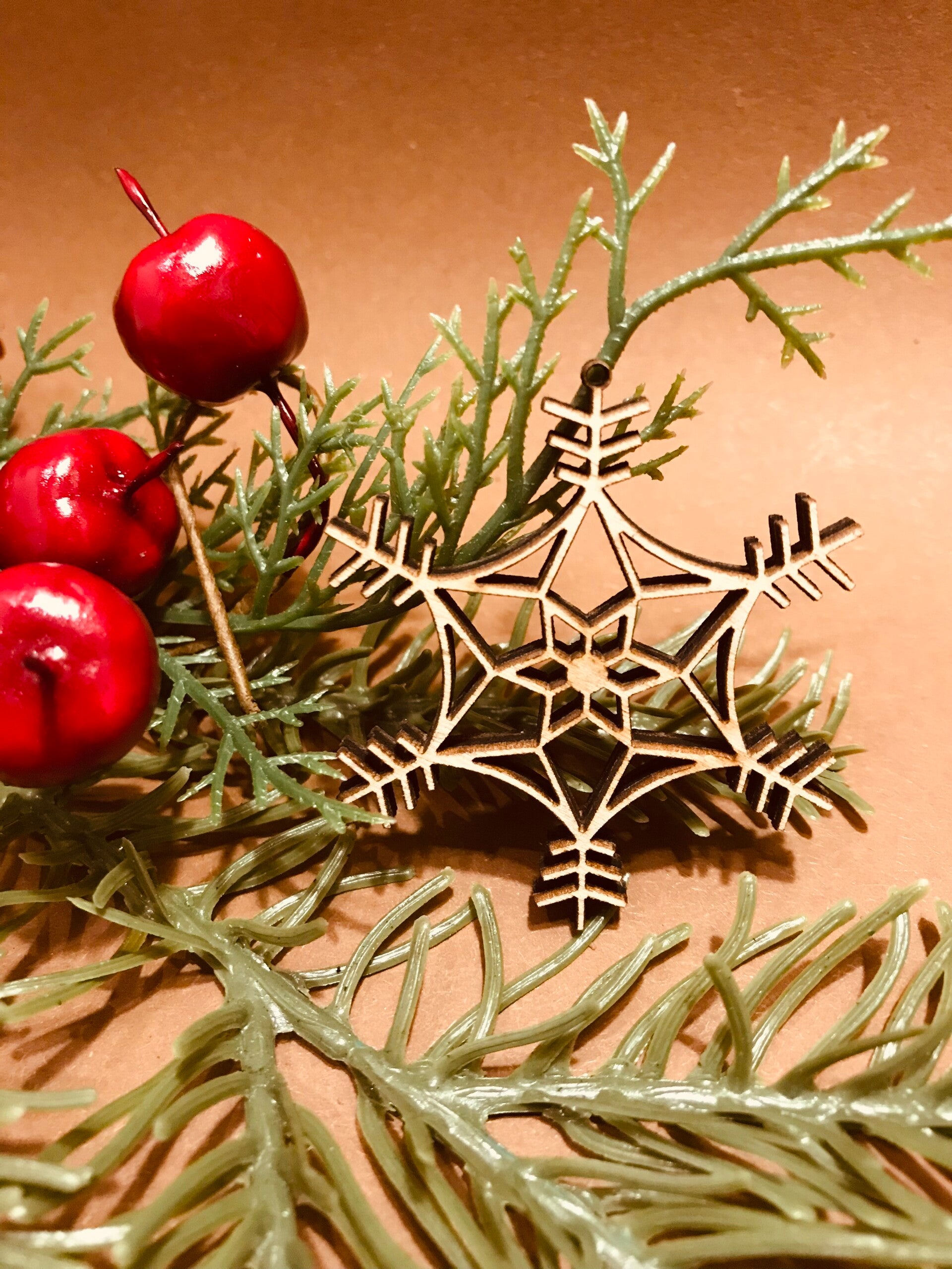 Mooie decoratieve houten sneeuwvlok. Deze sneeuwvlok van hout