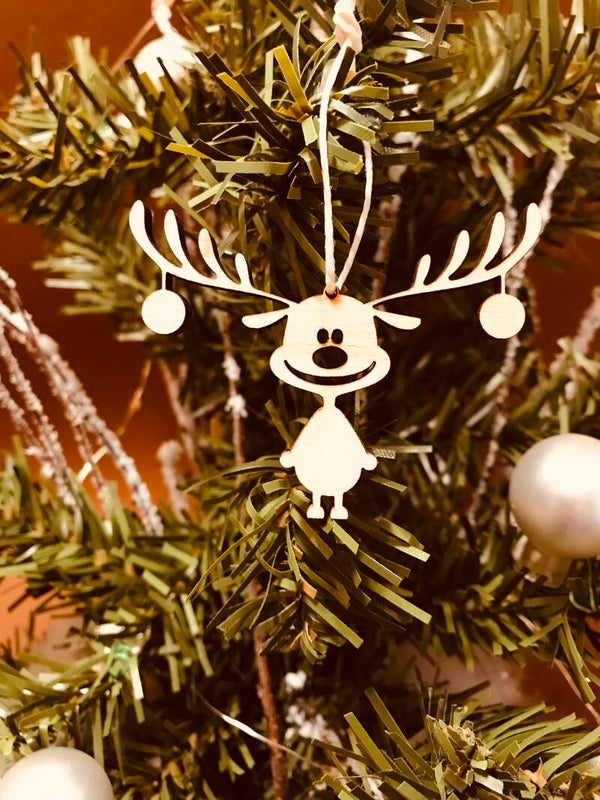 Grappige houten rendier met ophang gat en koord. Deze rendier van hout is te verkrijgen in de volgende maten: