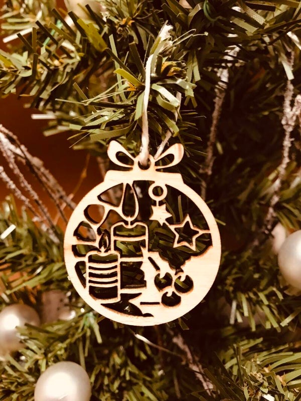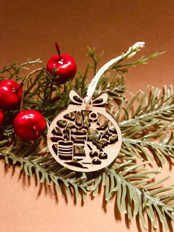 Kerstbal van hout met zeer fijn uitgesneden kaarsen en strik. Tevens heeft deze kerstbal een ophang gat met koord en is verkrijgbaar in de volgende maten: